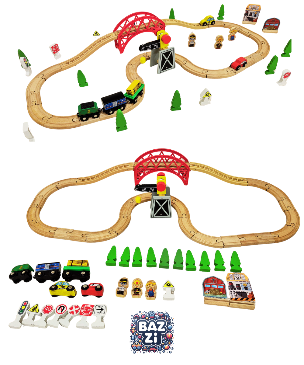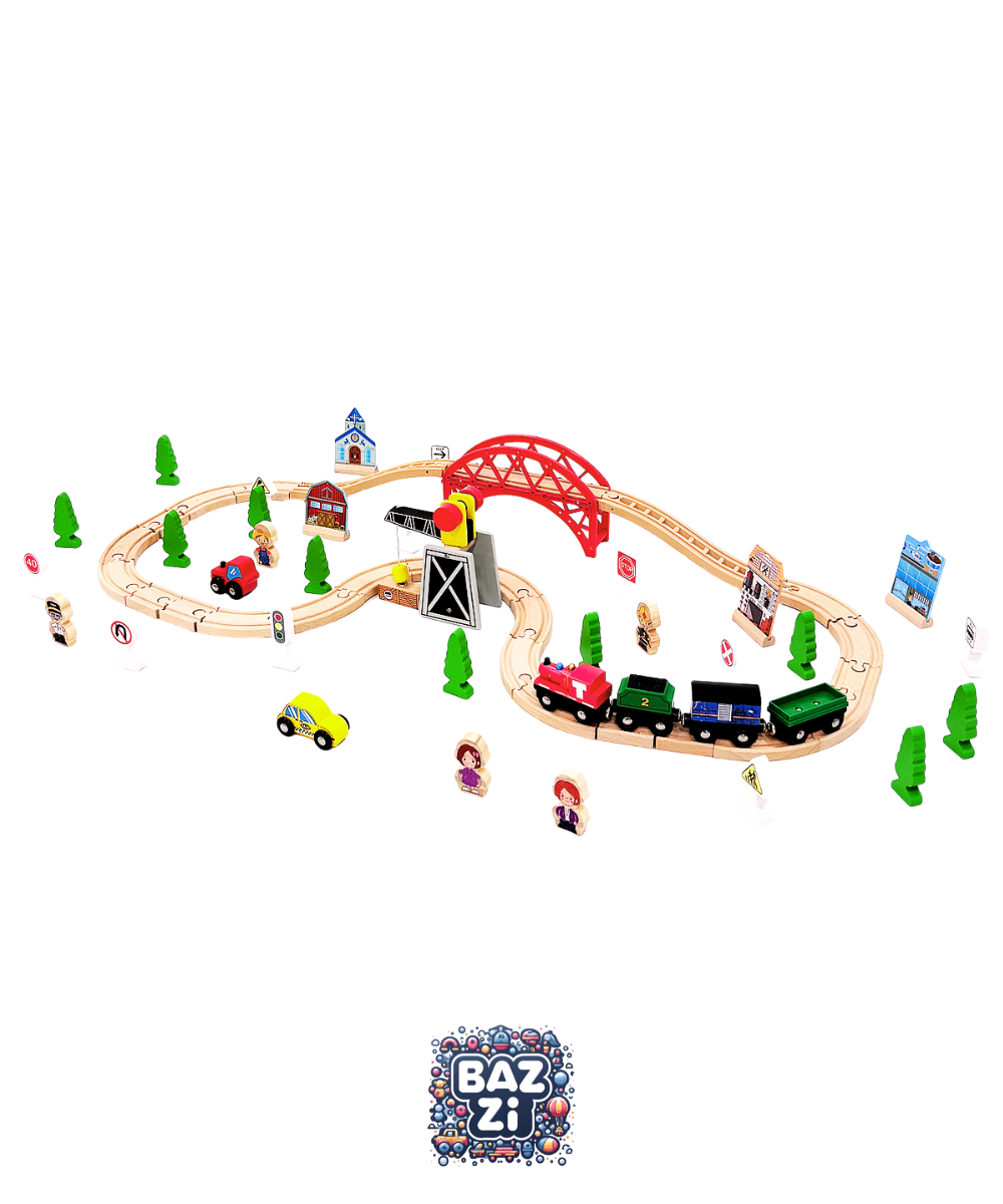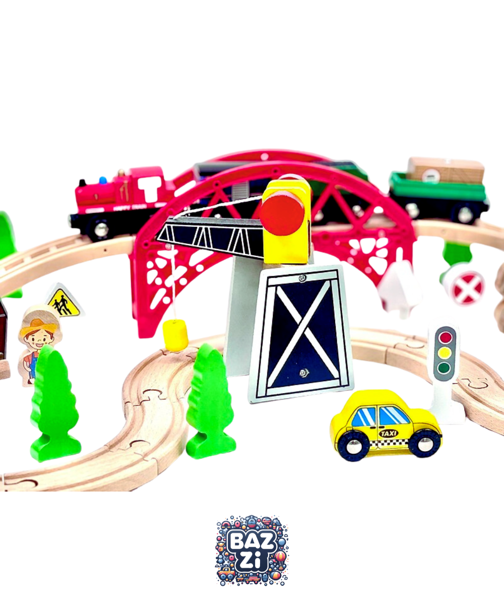 شامل ریلهای متنوع، قطارهای مغناطیسی، آدمکها، تابلوها، خانه و درخت برای ساخت مسیرهای جذابکمک به تقویت مهارتهای حل مسئله، هماهنگی چشم و دست و خلاقیت کودک